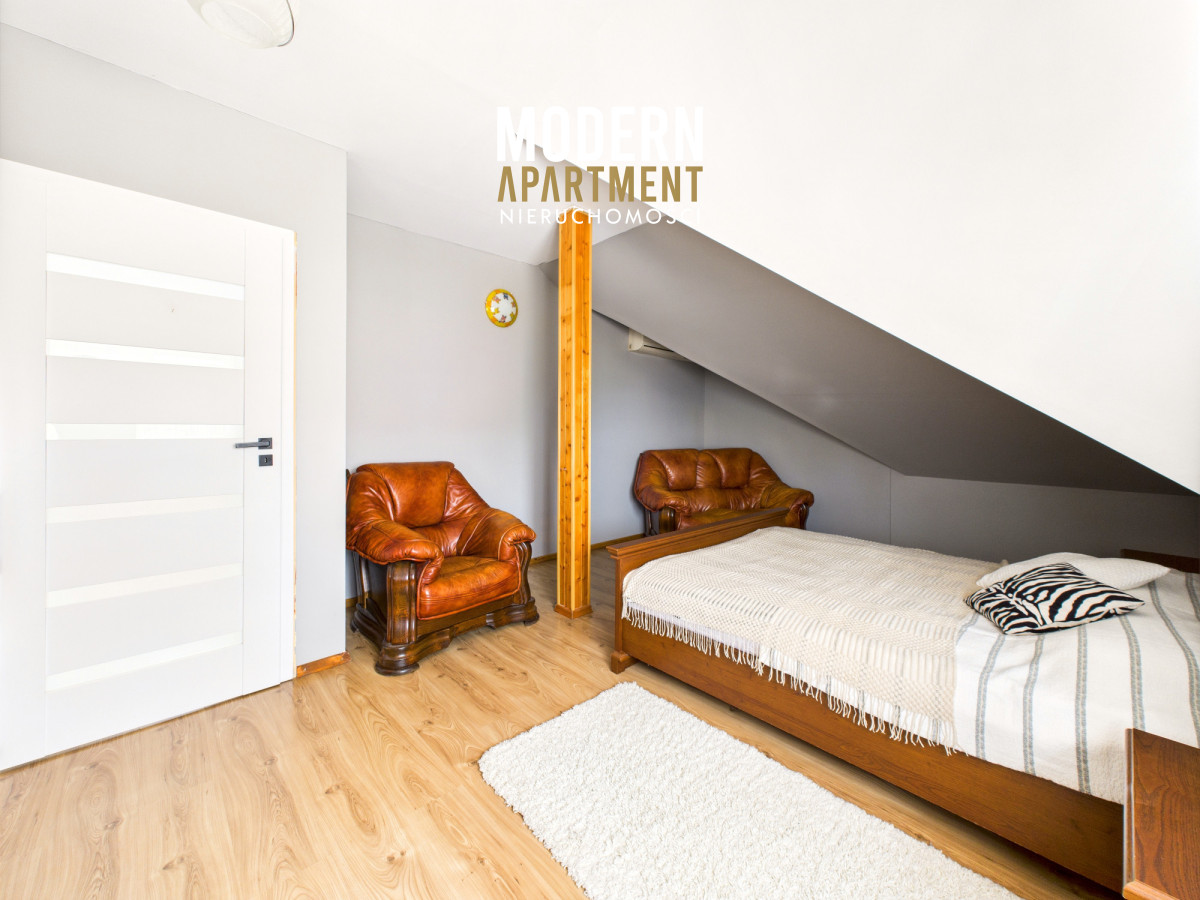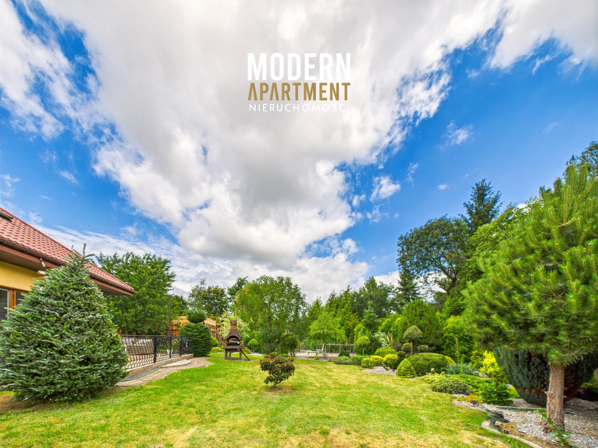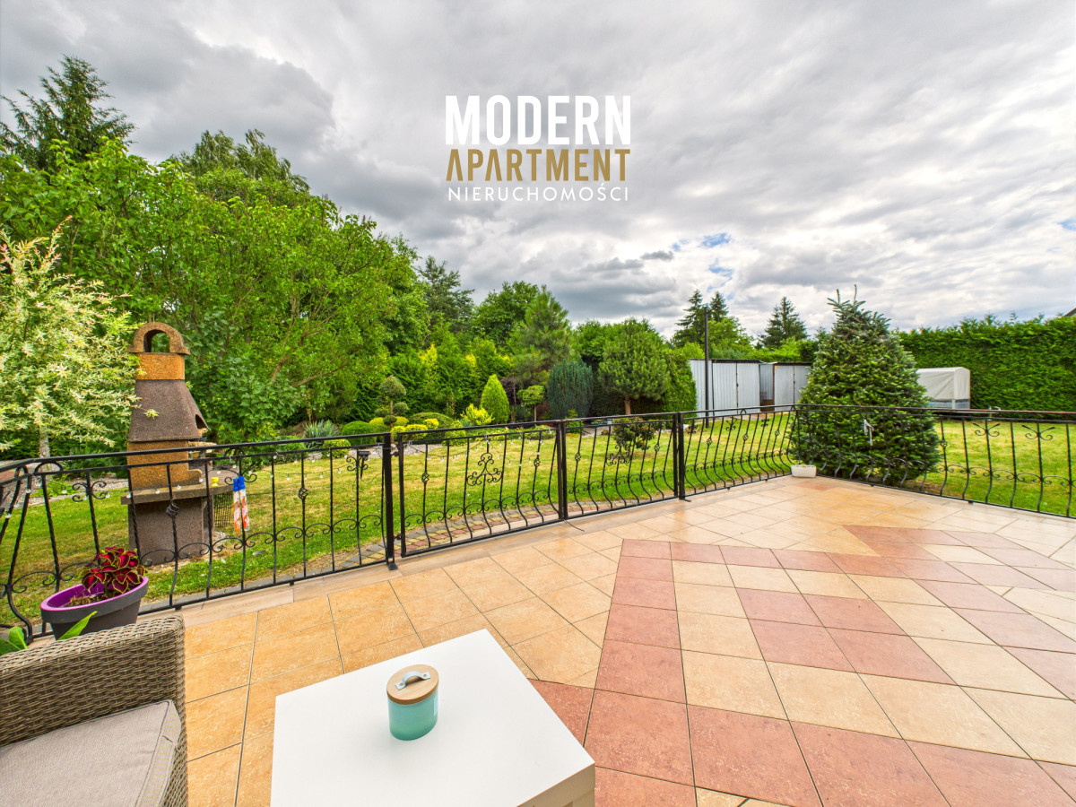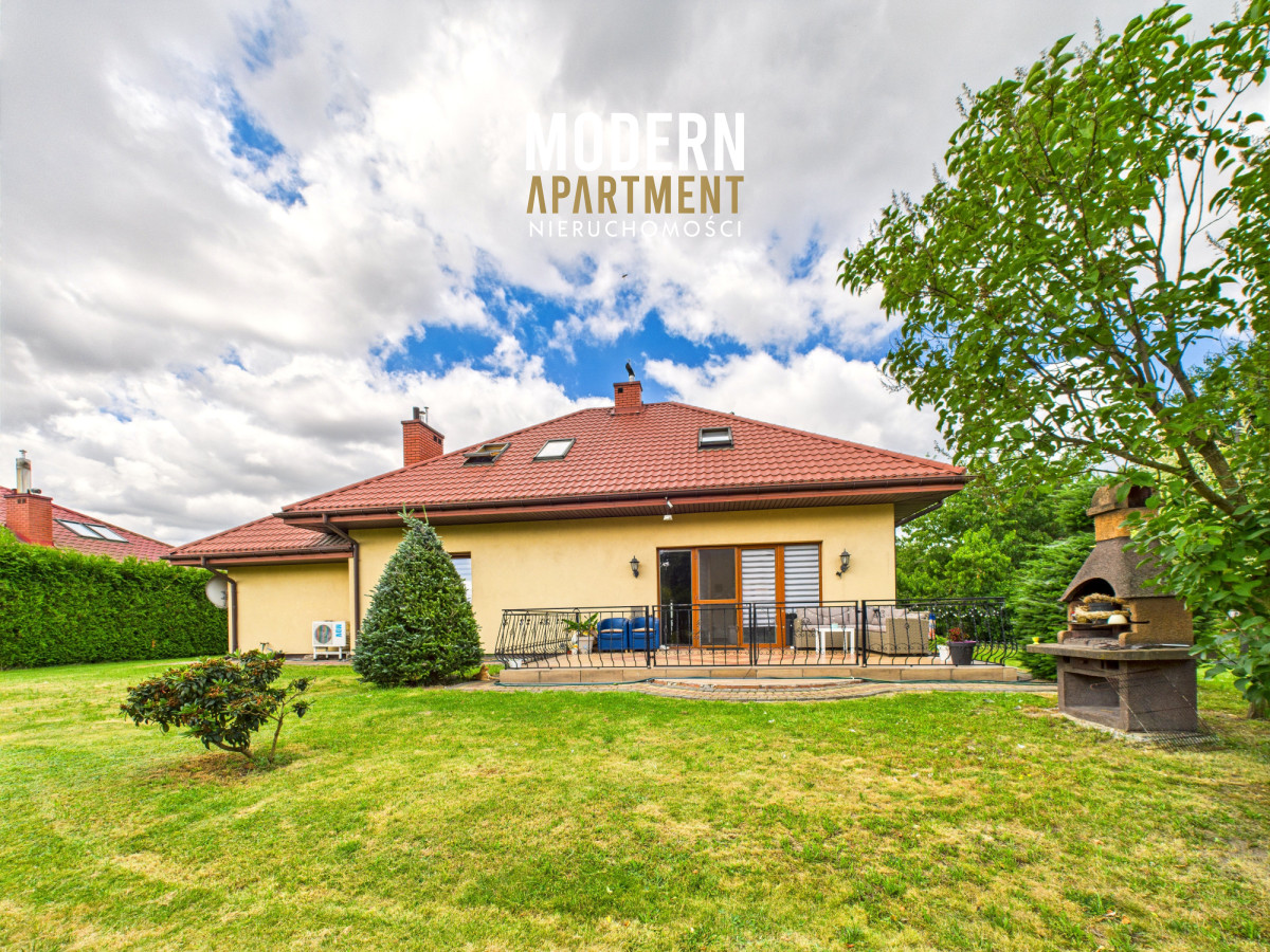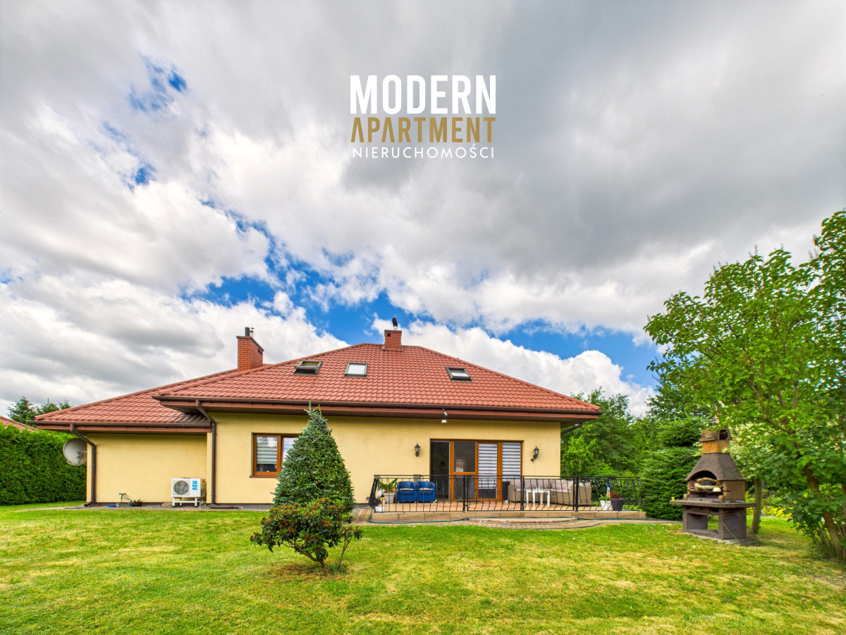 i funkcjonalne, a bardzo dobra ekspozycja sprawia, że dom jest doskonale doświetlony przez cały dzień. Na parterze znajduje się przedsionek z pojemną szafą w zabudowie, z którego przechodzimy do korytarza prowadzącego do przestronnego salonu z klimatycznym kominkiem. Salon połączony jest z jadalnią oraz kuchnią, a bezpośrednie wyjście na duży taras zapewnia wygodny dostęp do ogrodu. Ogród zachwyca starannie zaprojektowaną roślinnością, drzewami i krzewami owocowymi. Dodatkowo znajduje się tu utwardzona przestrzeń pod basen lub trampolinę, wolnostojący grill murowany, oraz dwa garaże blaszane pełniące funkcję magazynową. Na parterze znajduje się również sypialnia z dużą szafą na wymiar oraz przestronna łazienka z wanną, WC i bidetem. Z korytarza mamy dostęp do garażu, z którego przechodzimy do pomieszczenia gospodarczego pełniącego funkcję pralni. Piętro domu to strefa prywatna, na którą składają się trzy sypialnie (dwie wyposażone w klimatyzację). Z jednej z nich prowadzi wejście do pomieszczenia idealnego na garderobę, doświetlonego oknem dachowym typu Velux. Na piętrze znajduje się również łazienka z prysznicem, WC oraz biokominkiem.