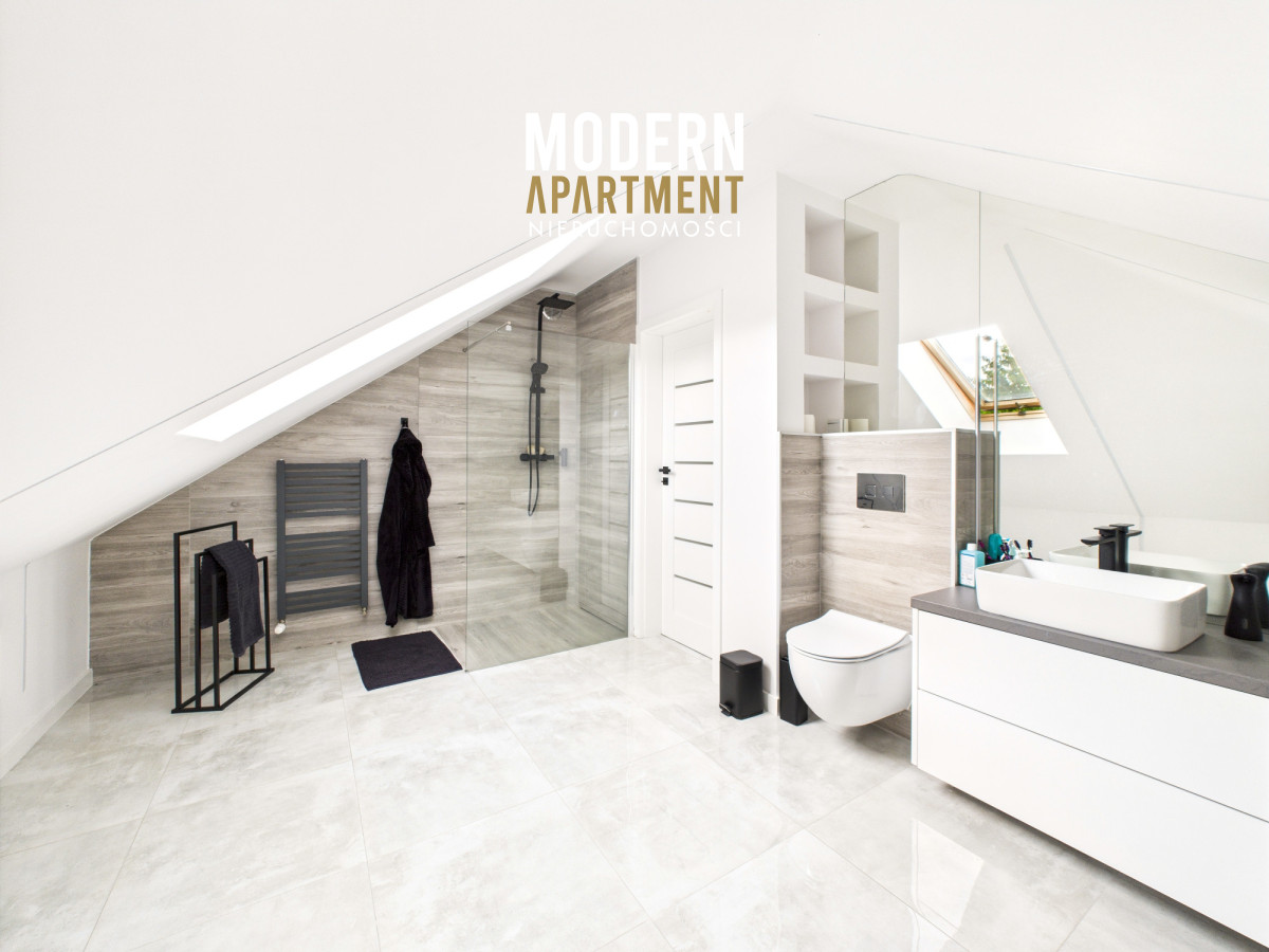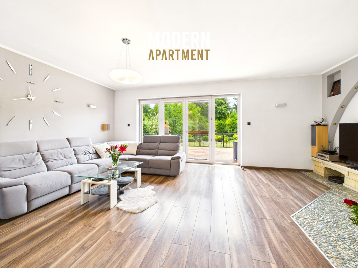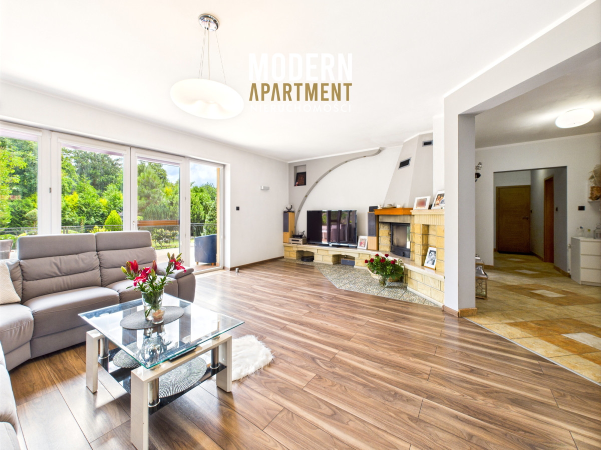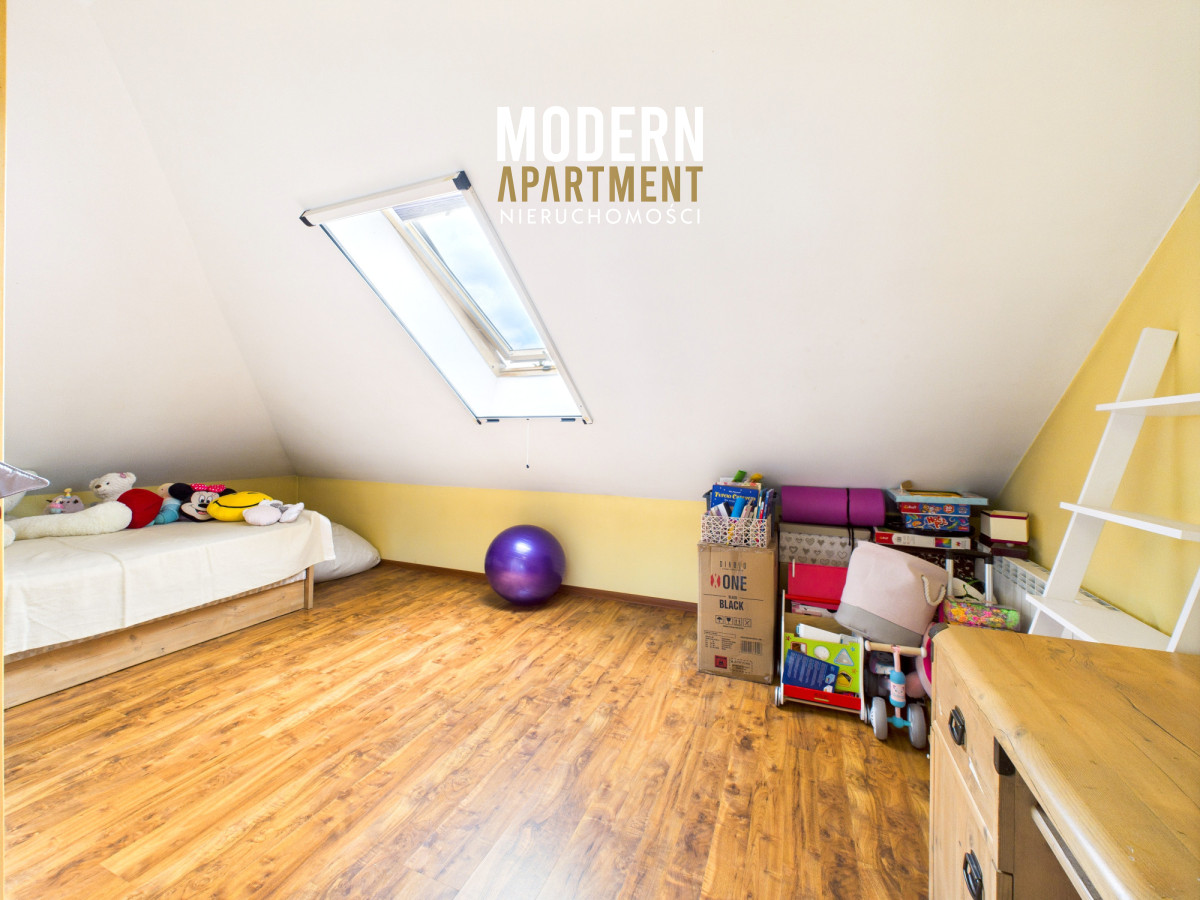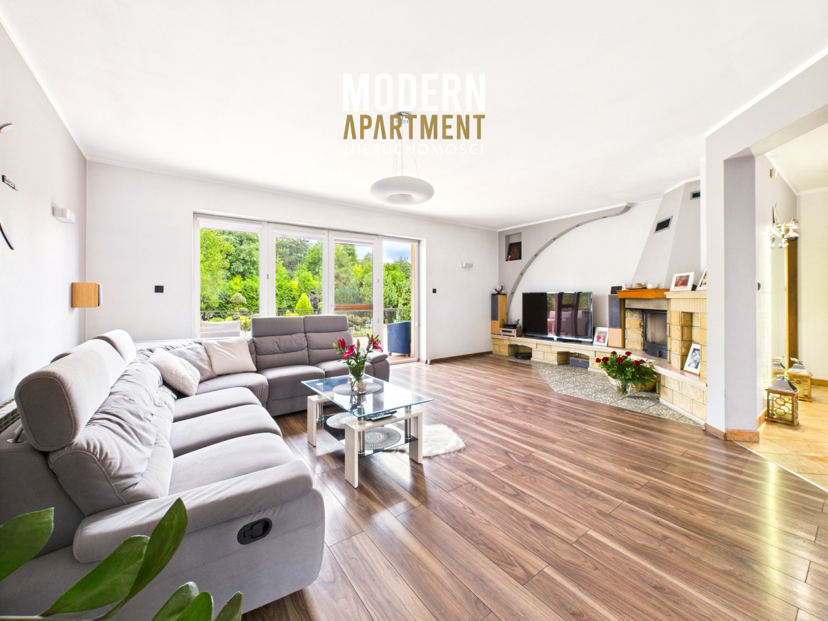 i funkcjonalne, a bardzo dobra ekspozycja sprawia, że dom jest doskonale doświetlony przez cały dzień. Na parterze znajduje się przedsionek z pojemną szafą w zabudowie, z którego przechodzimy do korytarza prowadzącego do przestronnego salonu z klimatycznym kominkiem. Salon połączony jest z jadalnią oraz kuchnią, a bezpośrednie wyjście na duży taras zapewnia wygodny dostęp do ogrodu. Ogród zachwyca starannie zaprojektowaną roślinnością, drzewami i krzewami owocowymi. Dodatkowo znajduje się tu utwardzona przestrzeń pod basen lub trampolinę, wolnostojący grill murowany, oraz dwa garaże blaszane pełniące funkcję magazynową. Na parterze znajduje się również sypialnia z dużą szafą na wymiar oraz przestronna łazienka z wanną, WC i bidetem. Z korytarza mamy dostęp do garażu, z którego przechodzimy do pomieszczenia gospodarczego pełniącego funkcję pralni. Piętro domu to strefa prywatna, na którą składają się trzy sypialnie (dwie wyposażone w klimatyzację). Z jednej z nich prowadzi wejście do pomieszczenia idealnego na garderobę, doświetlonego oknem dachowym typu Velux. Na piętrze znajduje się również łazienka z prysznicem, WC oraz biokominkiem.