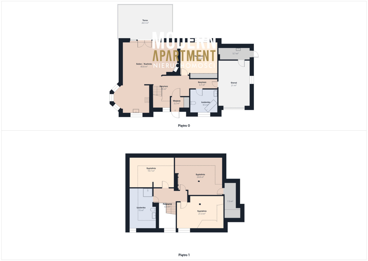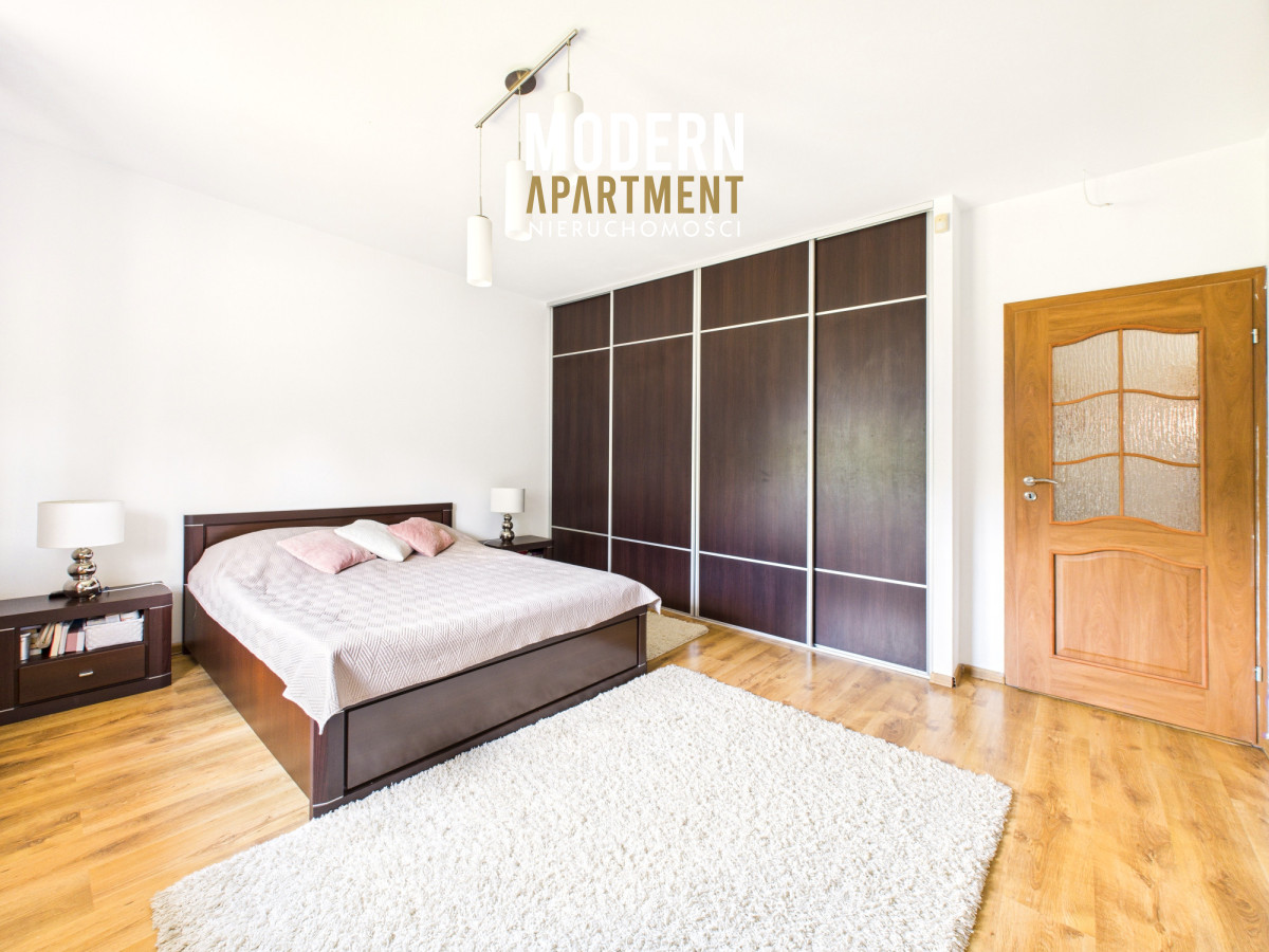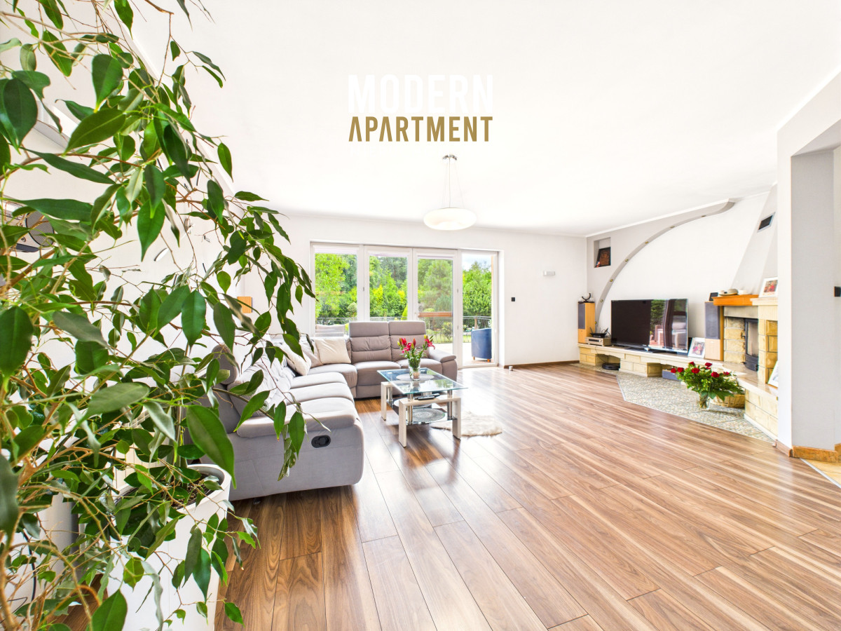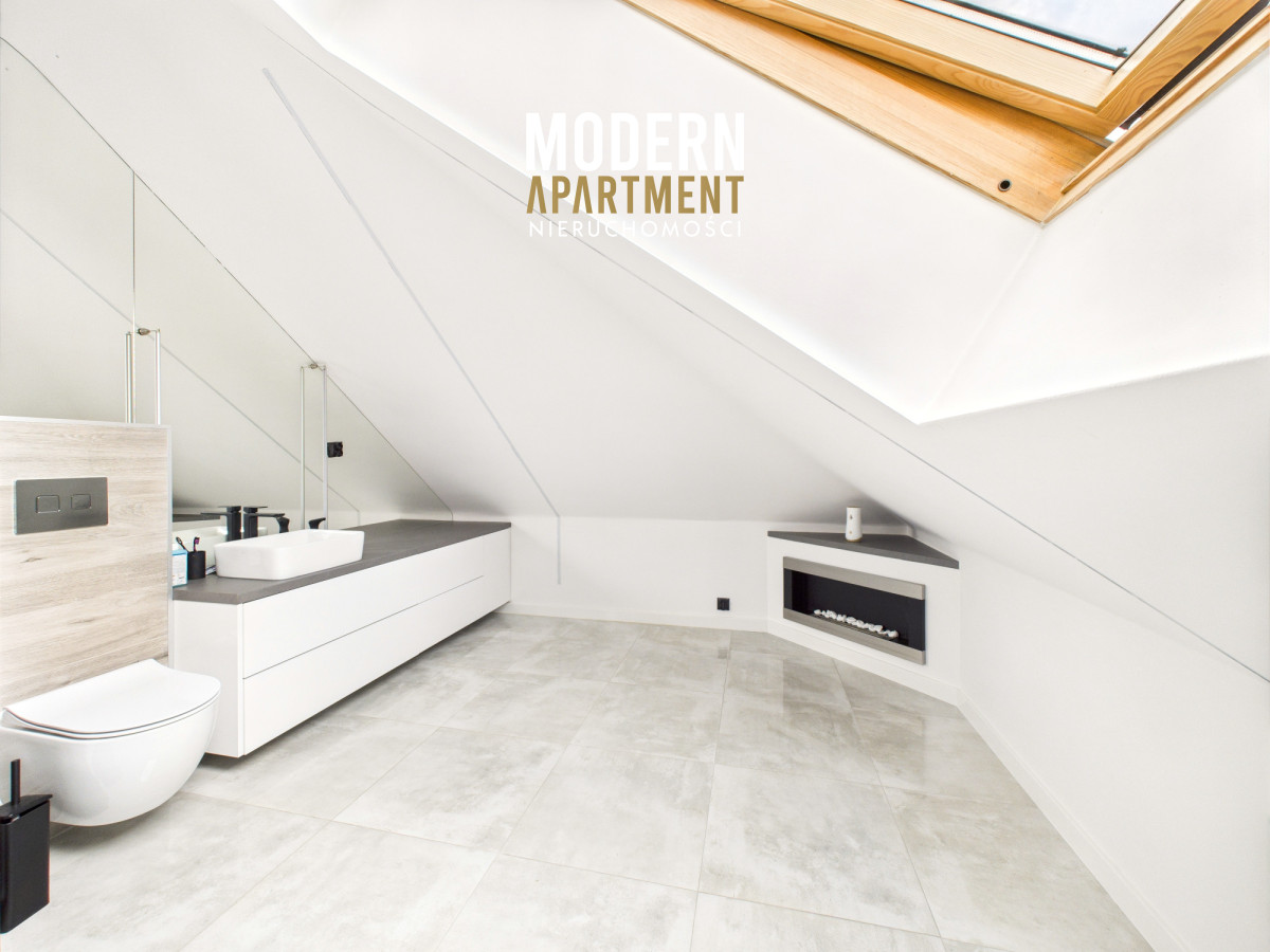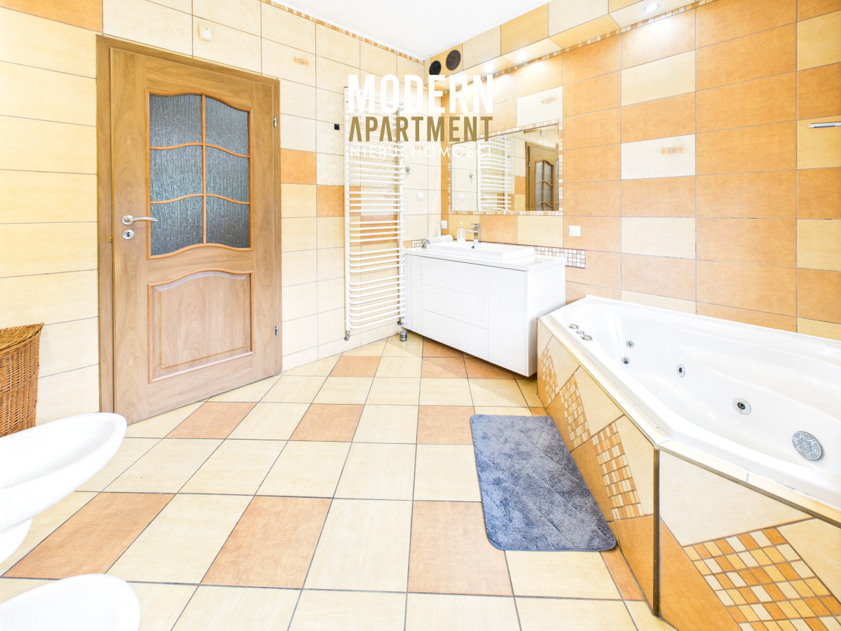 i funkcjonalne, a bardzo dobra ekspozycja sprawia, że dom jest doskonale doświetlony przez cały dzień. Na parterze znajduje się przedsionek z pojemną szafą w zabudowie, z którego przechodzimy do korytarza prowadzącego do przestronnego salonu z klimatycznym kominkiem. Salon połączony jest z jadalnią oraz kuchnią, a bezpośrednie wyjście na duży taras zapewnia wygodny dostęp do ogrodu. Ogród zachwyca starannie zaprojektowaną roślinnością, drzewami i krzewami owocowymi. Dodatkowo znajduje się tu utwardzona przestrzeń pod basen lub trampolinę, wolnostojący grill murowany, oraz dwa garaże blaszane pełniące funkcję magazynową. Na parterze znajduje się również sypialnia z dużą szafą na wymiar oraz przestronna łazienka z wanną, WC i bidetem. Z korytarza mamy dostęp do garażu, z którego przechodzimy do pomieszczenia gospodarczego pełniącego funkcję pralni. Piętro domu to strefa prywatna, na którą składają się trzy sypialnie (dwie wyposażone w klimatyzację). Z jednej z nich prowadzi wejście do pomieszczenia idealnego na garderobę, doświetlonego oknem dachowym typu Velux. Na piętrze znajduje się również łazienka z prysznicem, WC oraz biokominkiem.