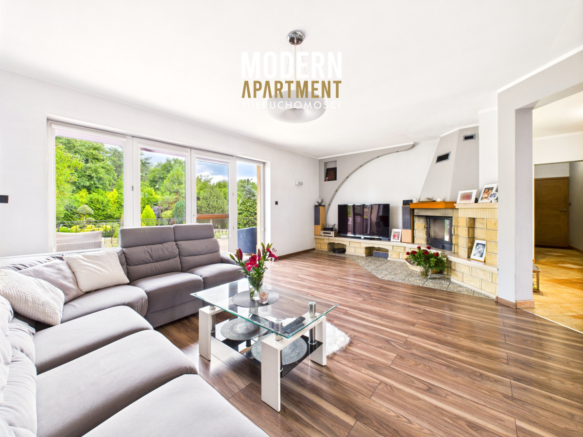 - salon z kominkiem i wyjściem na taras, połączony z kuchnią i jadalnią