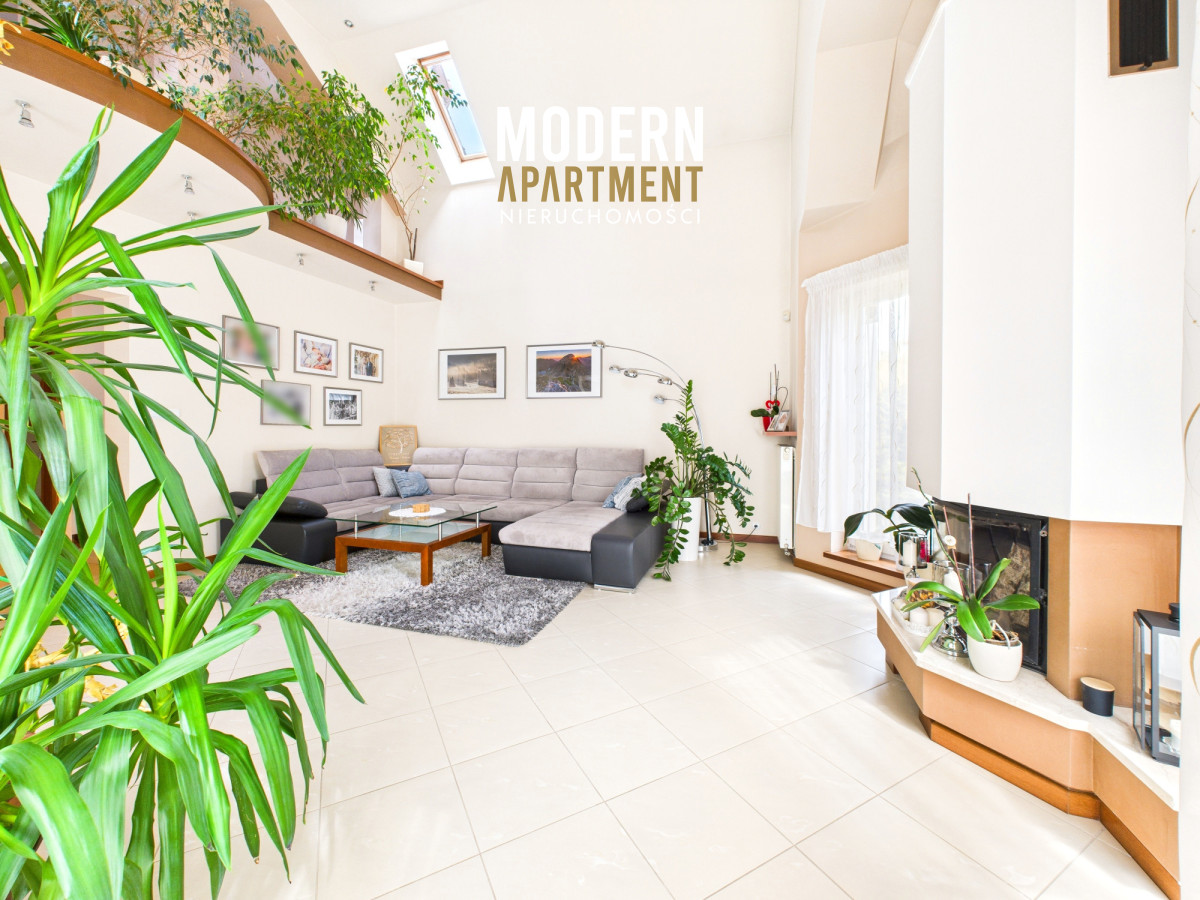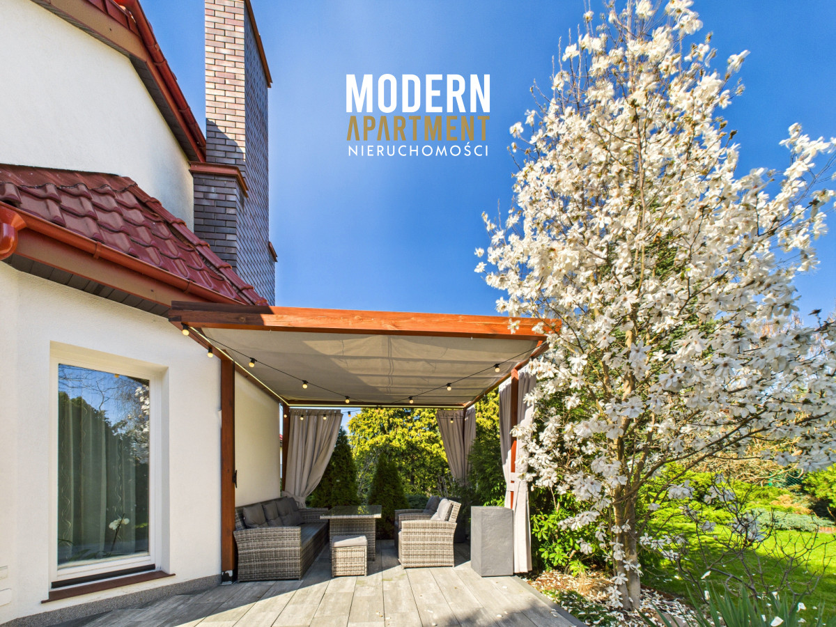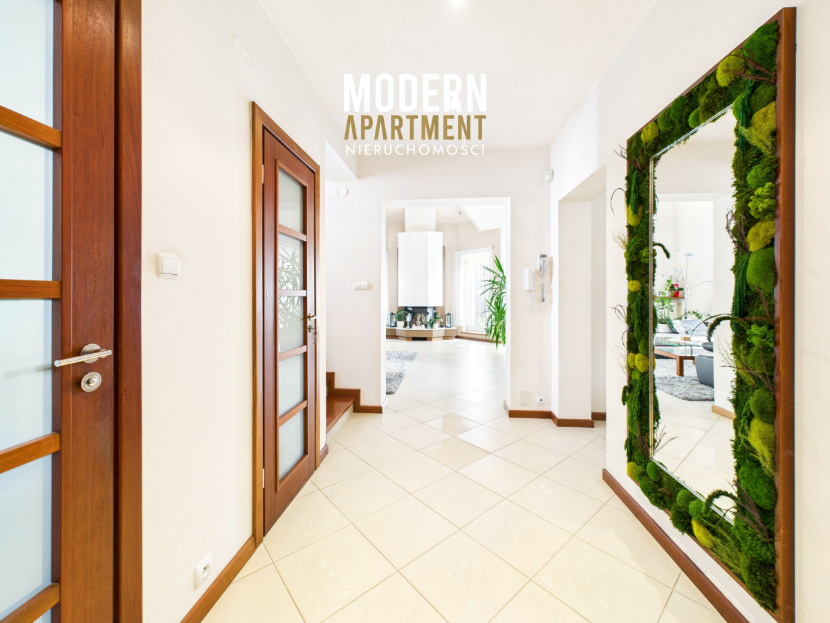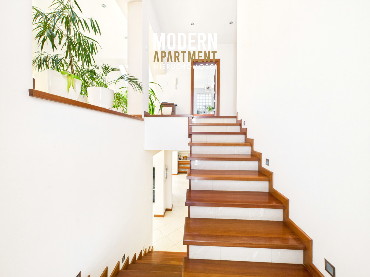 Z salonu prowadzi wyjście na taras oraz do pięknie zaprojektowanego ogrodu, w którym znajduje się strefa relaksu z pergolą i zadaszeniem — idealne miejsce na odpoczynek po dniu pracy w Warszawie. Piętro domu stanowi komfortową strefę prywatną. Znajdują się tu trzy przestronne sypialnie, każda z własnym balkonem, oddzielna garderoba oraz duża łazienka wyposażona w wannę, podwójną umywalkę, WC i bidet. Antresola, obecnie zaaranżowana jako wewnętrzny zielony ogród, pełni funkcję naturalnego systemu poprawiającego jakość powietrza w domu.