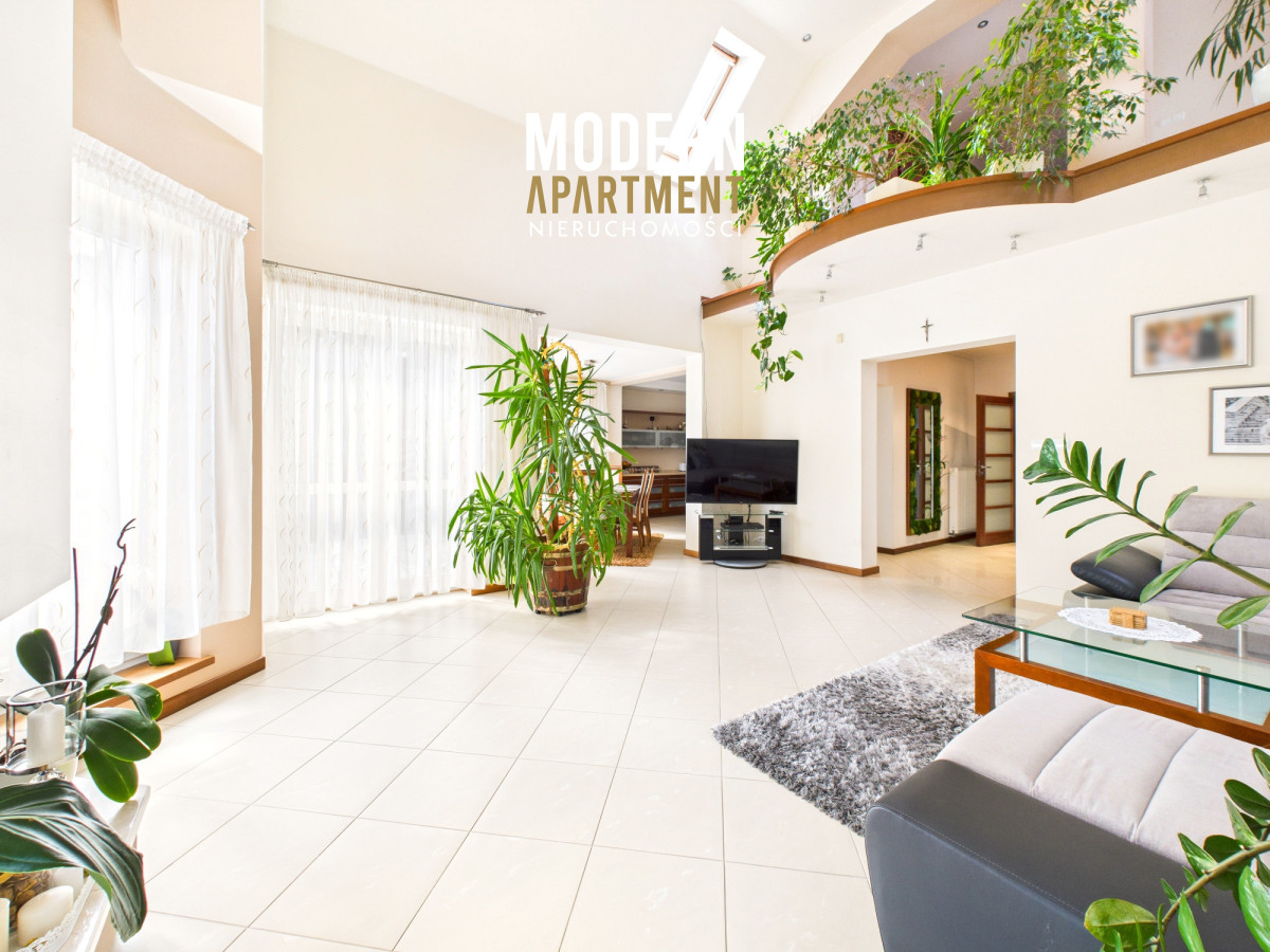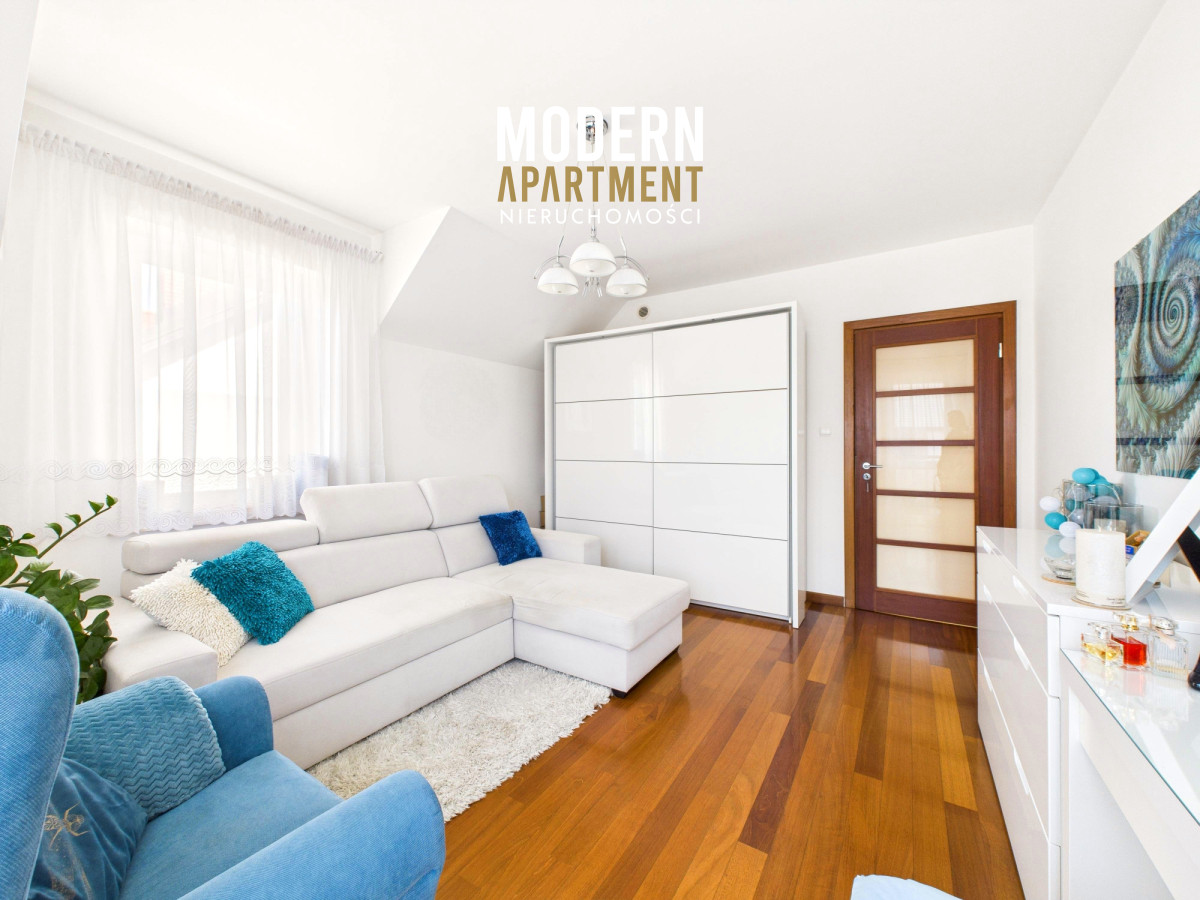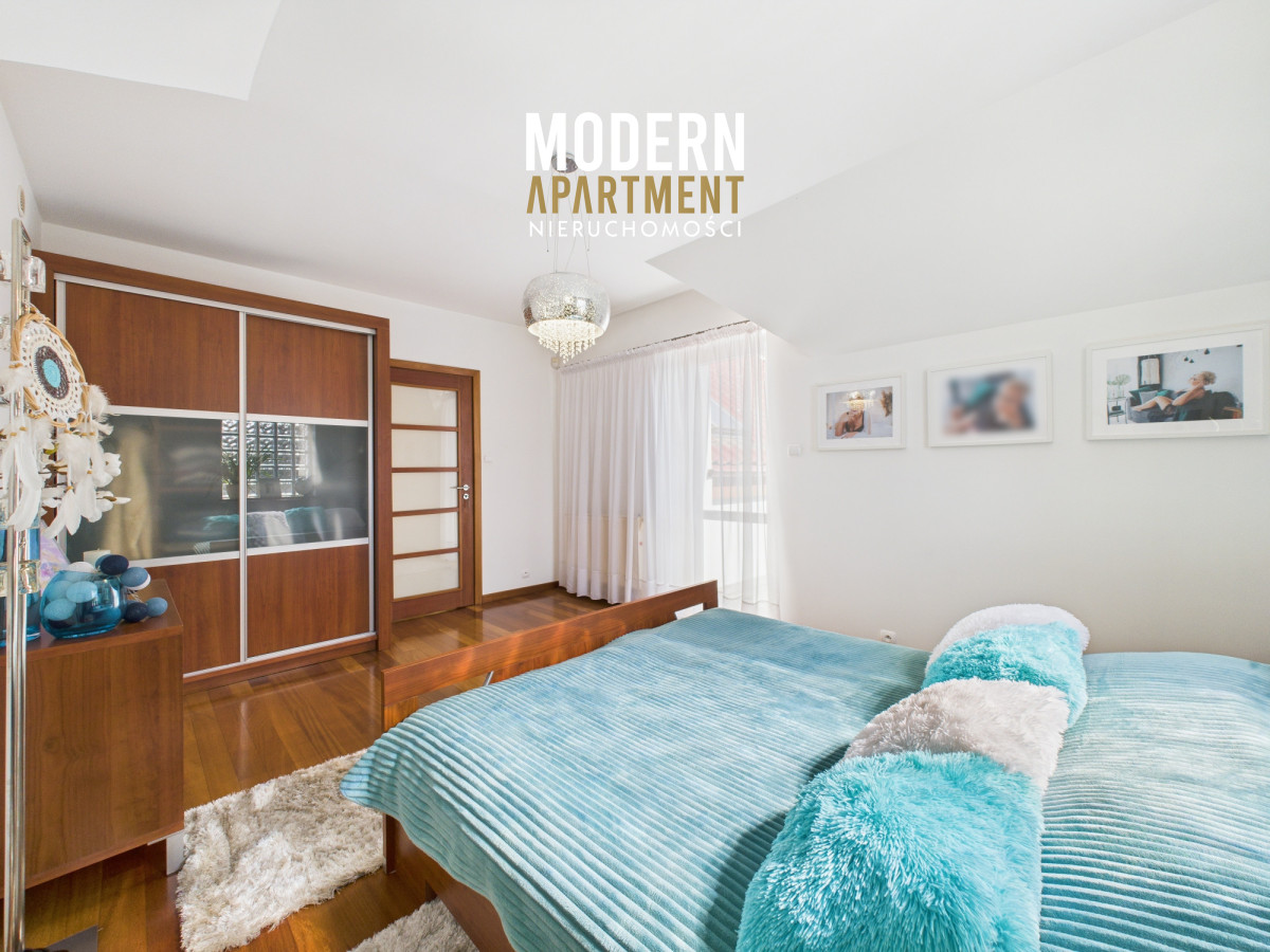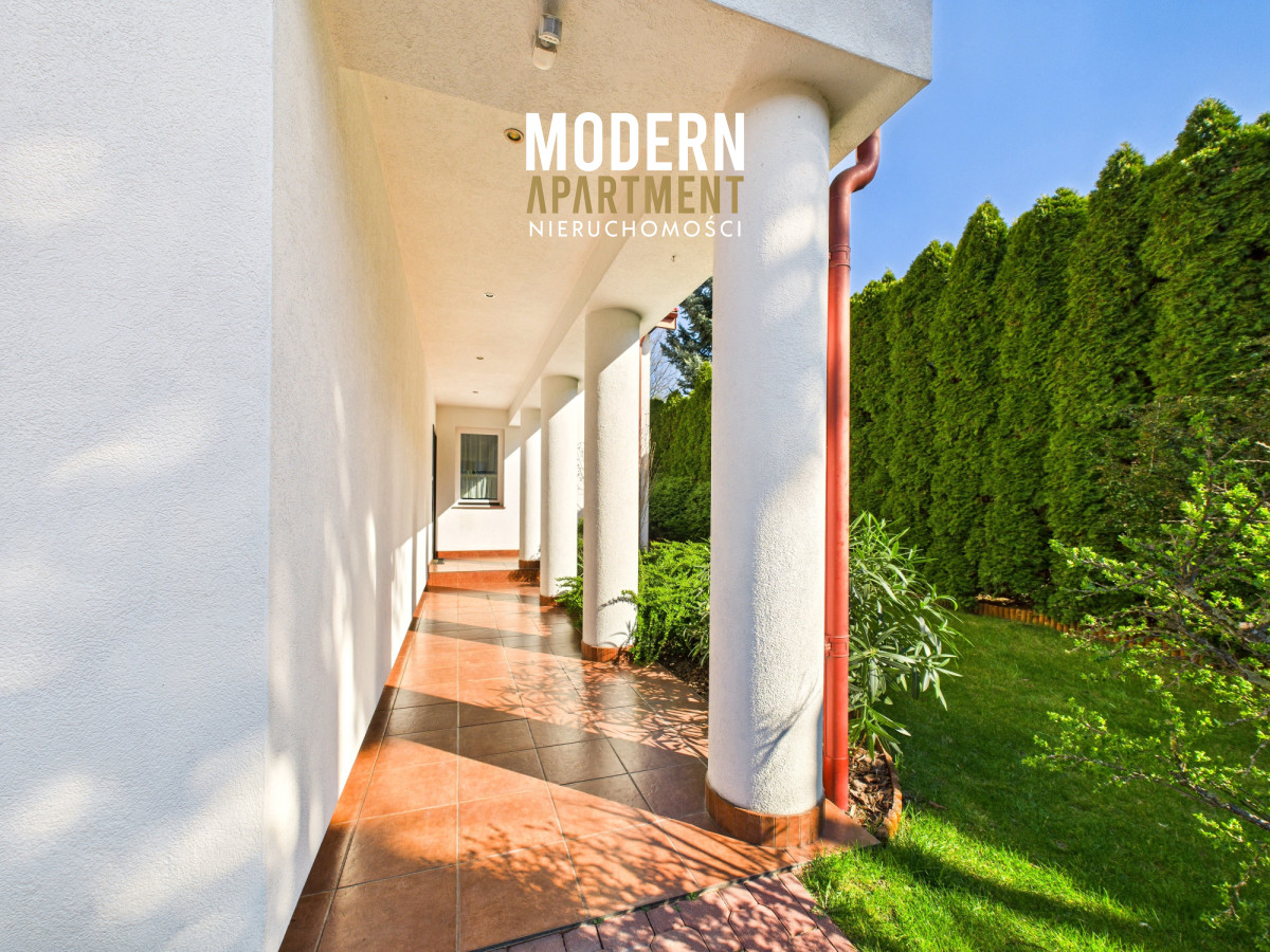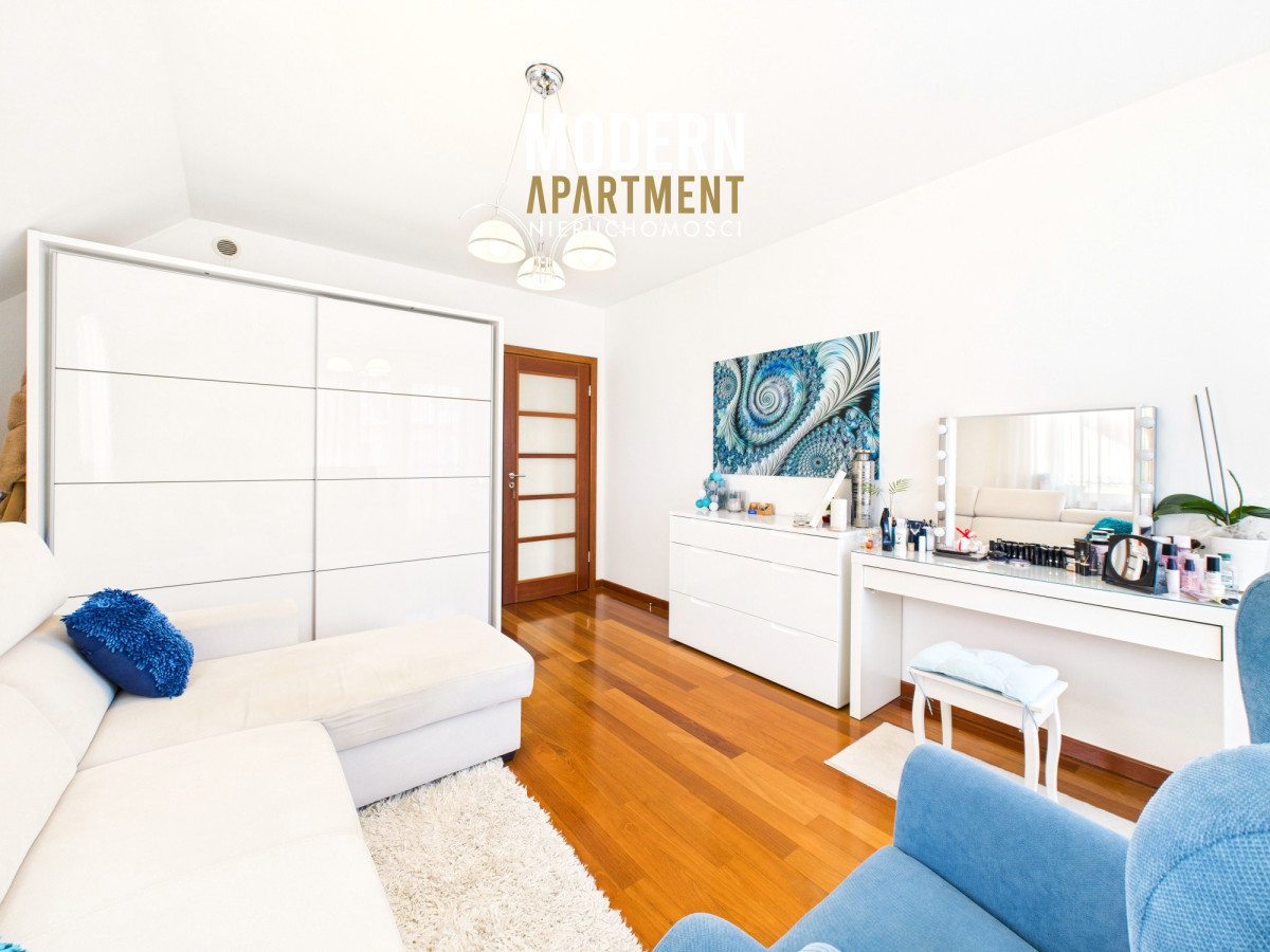 Z salonu prowadzi wyjście na taras oraz do pięknie zaprojektowanego ogrodu, w którym znajduje się strefa relaksu z pergolą i zadaszeniem — idealne miejsce na odpoczynek po dniu pracy w Warszawie. Piętro domu stanowi komfortową strefę prywatną. Znajdują się tu trzy przestronne sypialnie, każda z własnym balkonem, oddzielna garderoba oraz duża łazienka wyposażona w wannę, podwójną umywalkę, WC i bidet. Antresola, obecnie zaaranżowana jako wewnętrzny zielony ogród, pełni funkcję naturalnego systemu poprawiającego jakość powietrza w domu.