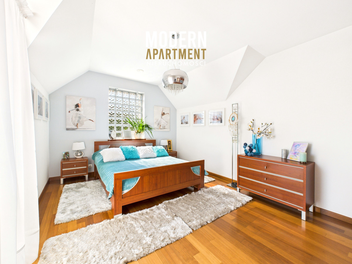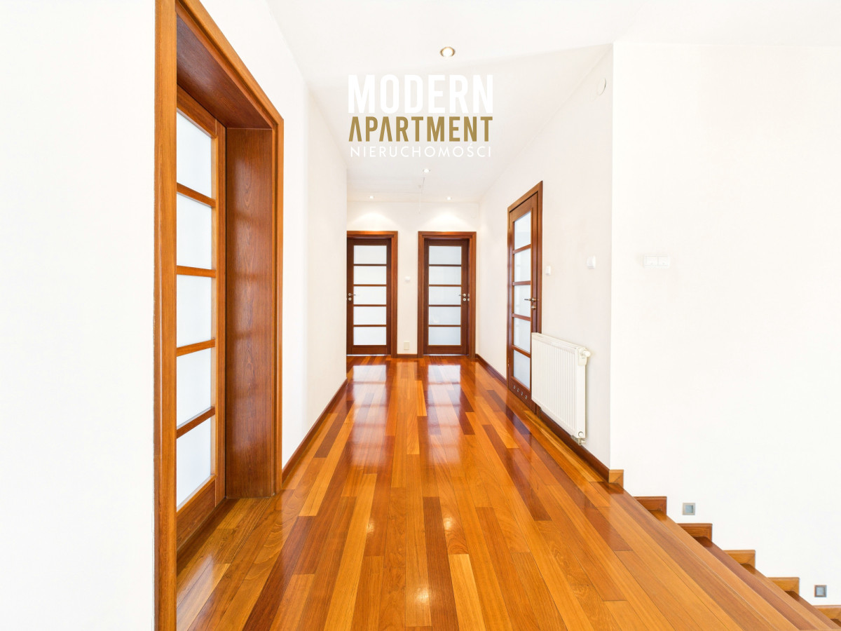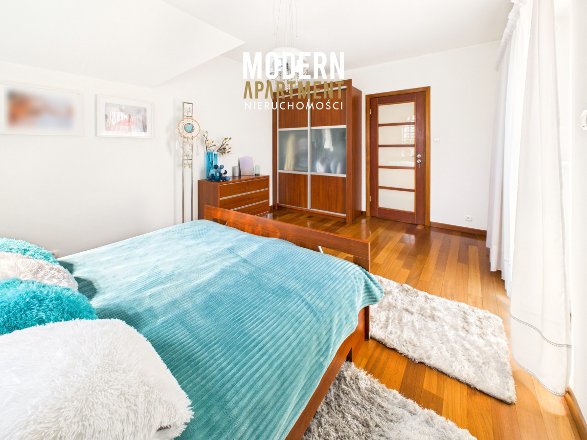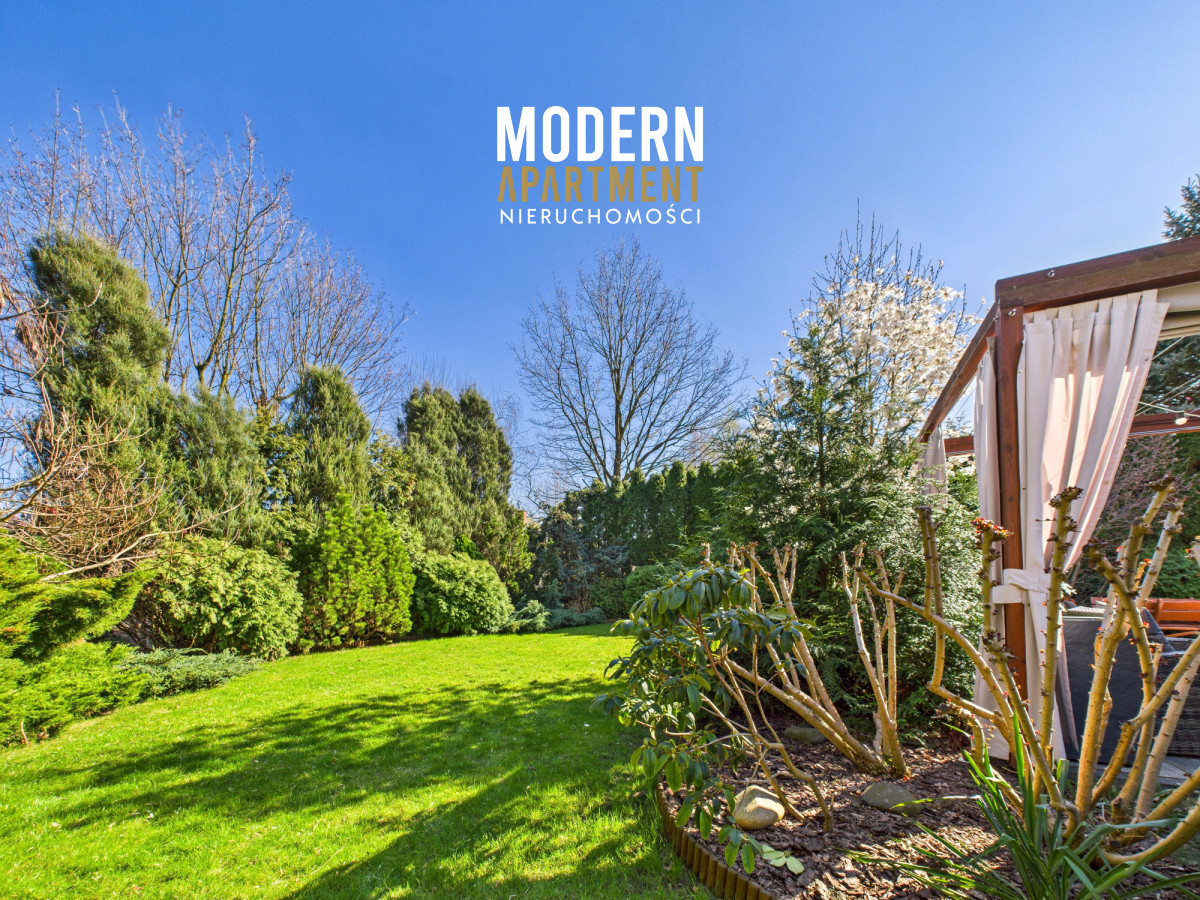 Z salonu prowadzi wyjście na taras oraz do pięknie zaprojektowanego ogrodu, w którym znajduje się strefa relaksu z pergolą i zadaszeniem — idealne miejsce na odpoczynek po dniu pracy w Warszawie. Piętro domu stanowi komfortową strefę prywatną. Znajdują się tu trzy przestronne sypialnie, każda z własnym balkonem, oddzielna garderoba oraz duża łazienka wyposażona w wannę, podwójną umywalkę, WC i bidet. Antresola, obecnie zaaranżowana jako wewnętrzny zielony ogród, pełni funkcję naturalnego systemu poprawiającego jakość powietrza w domu.