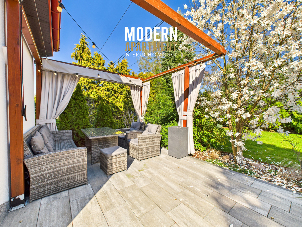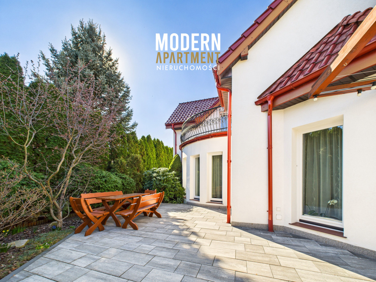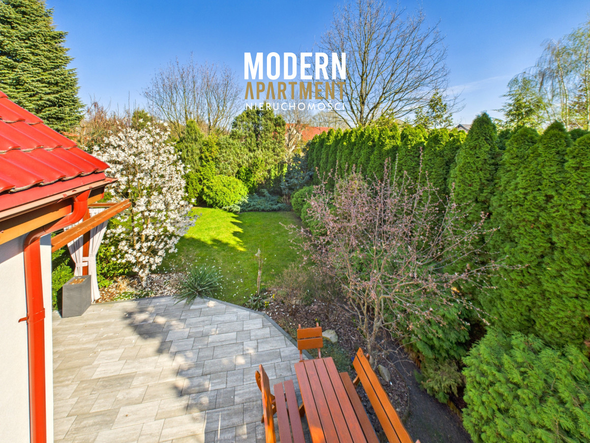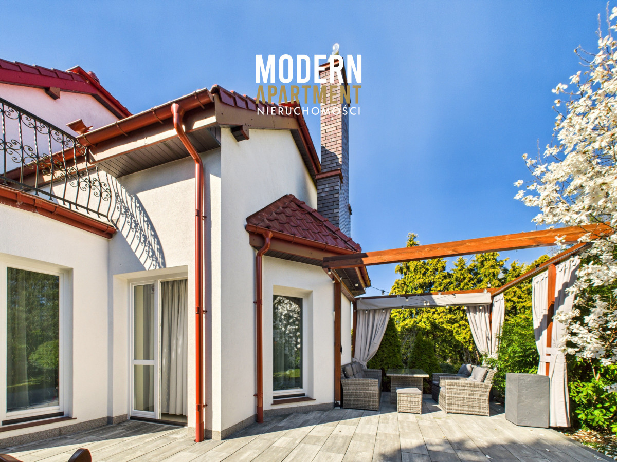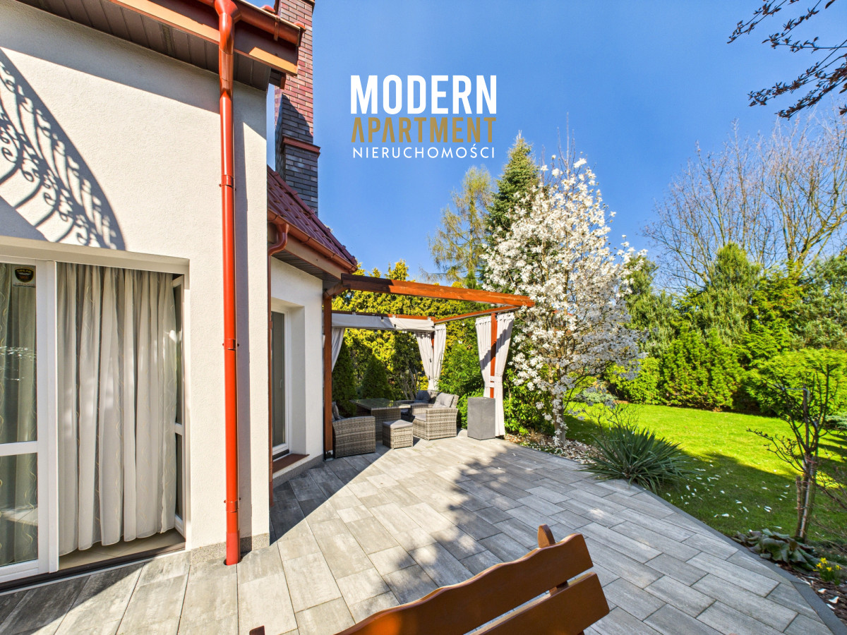 w dwufunkcyjny piec gazowy, kominek z rozprowadzeniem ciepła, centralny odkurzacz, system alarmowy oraz światłowód. Brama wjazdowa i garażowa sterowane są elektrycznie. Dach pokryty dachówką ceramiczną, okna, drzwi i parapety wykonane z drewna. Podłogi wykończone drewnem egzotycznym (czereśnia amerykańska) oraz gresem. Dojazd do posesji prowadzi utwardzoną i oświetloną drogą z kostki brukowej. Ogród wyposażony w system automatycznego podlewania. Zbiornik na deszczówkę zapewnia dostęp do wody nieograniczając dbania o ogród w okresach intensywnych upałów i suszy.