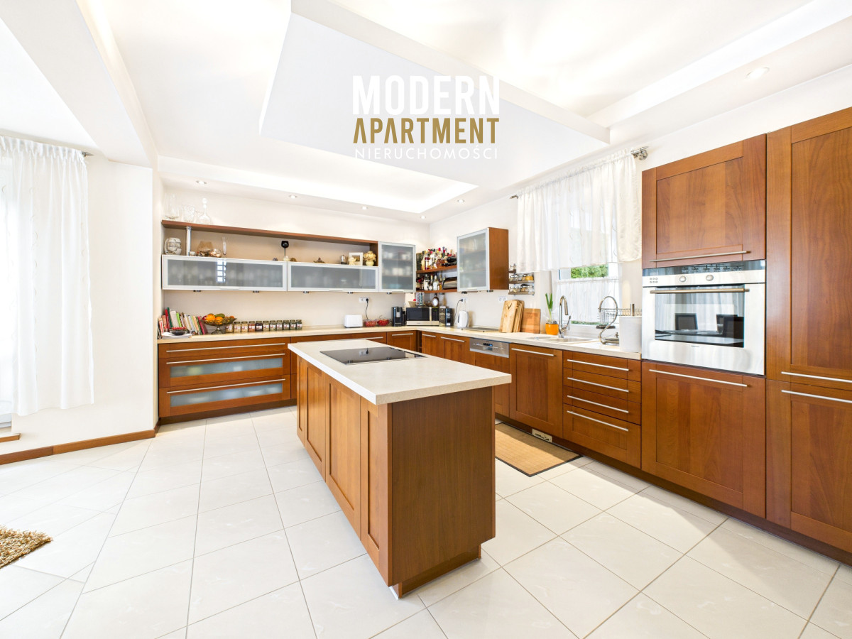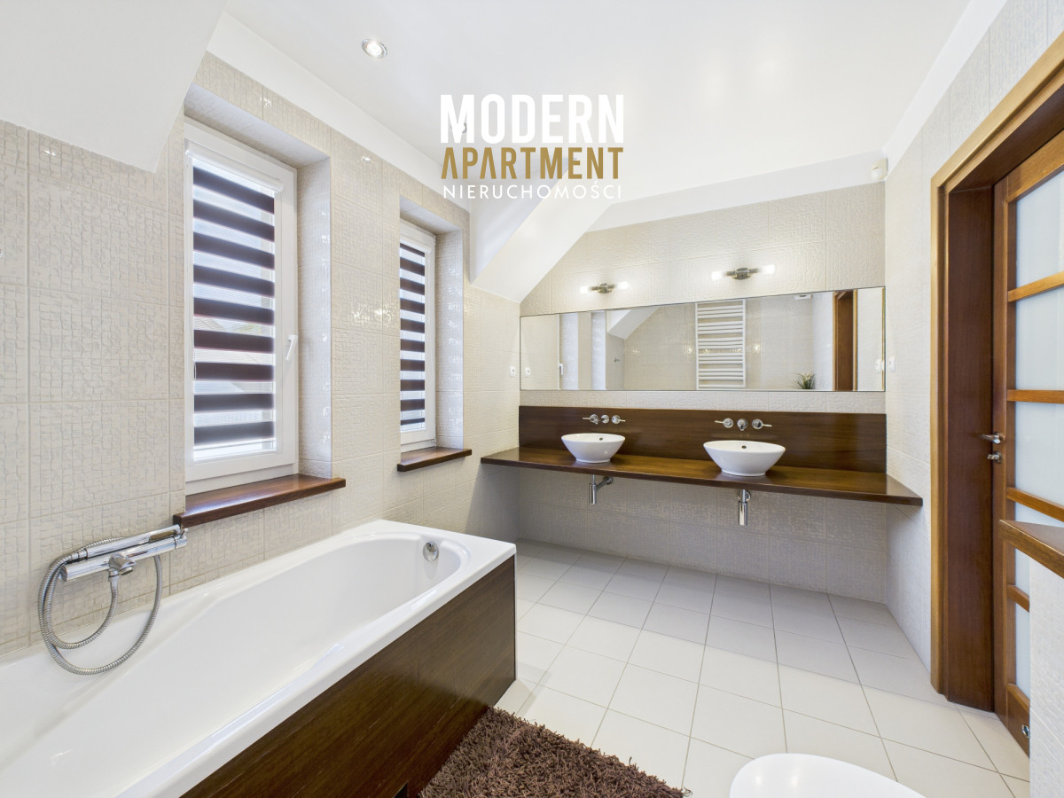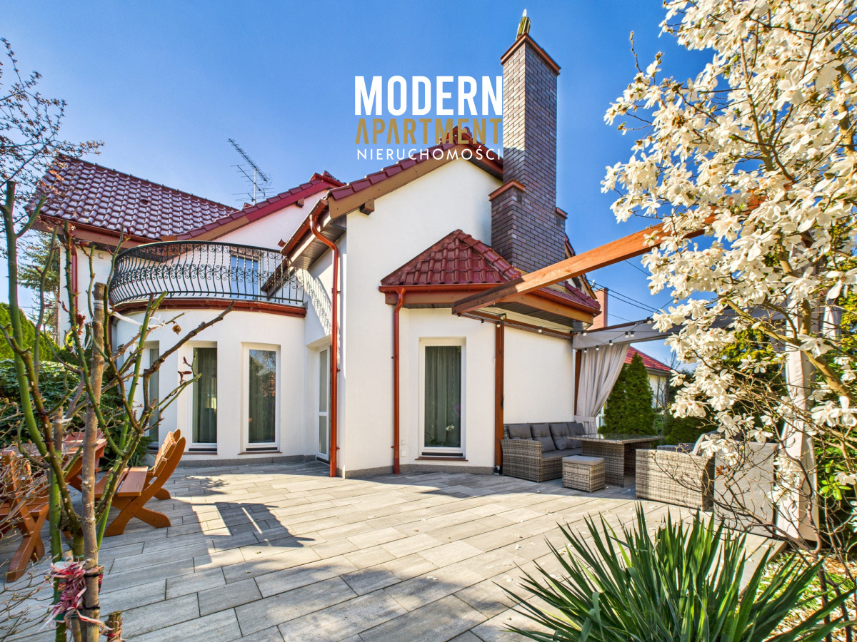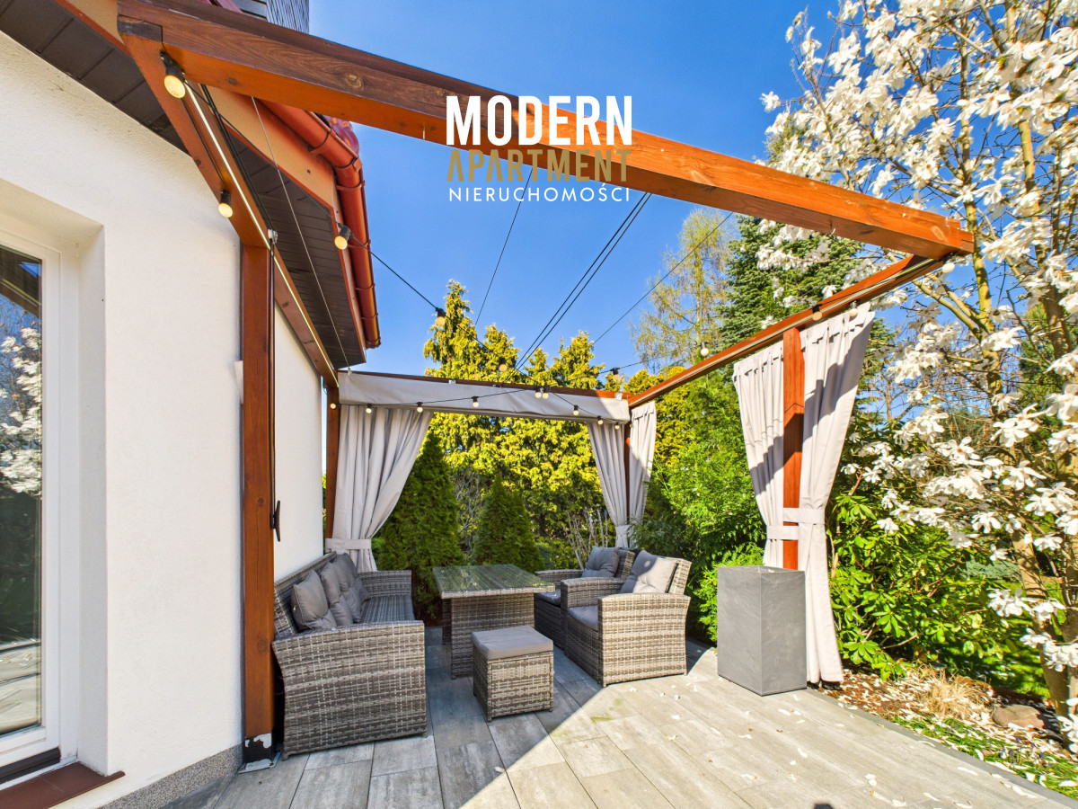w dwufunkcyjny piec gazowy, kominek z rozprowadzeniem ciepła, centralny odkurzacz, system alarmowy oraz światłowód. Brama wjazdowa i garażowa sterowane są elektrycznie. Dach pokryty dachówką ceramiczną, okna, drzwi i parapety wykonane z drewna. Podłogi wykończone drewnem egzotycznym (czereśnia amerykańska) oraz gresem. Dojazd do posesji prowadzi utwardzoną i oświetloną drogą z kostki brukowej. Ogród wyposażony w system automatycznego podlewania. Zbiornik na deszczówkę zapewnia dostęp do wody nieograniczając dbania o ogród w okresach intensywnych upałów i suszy.