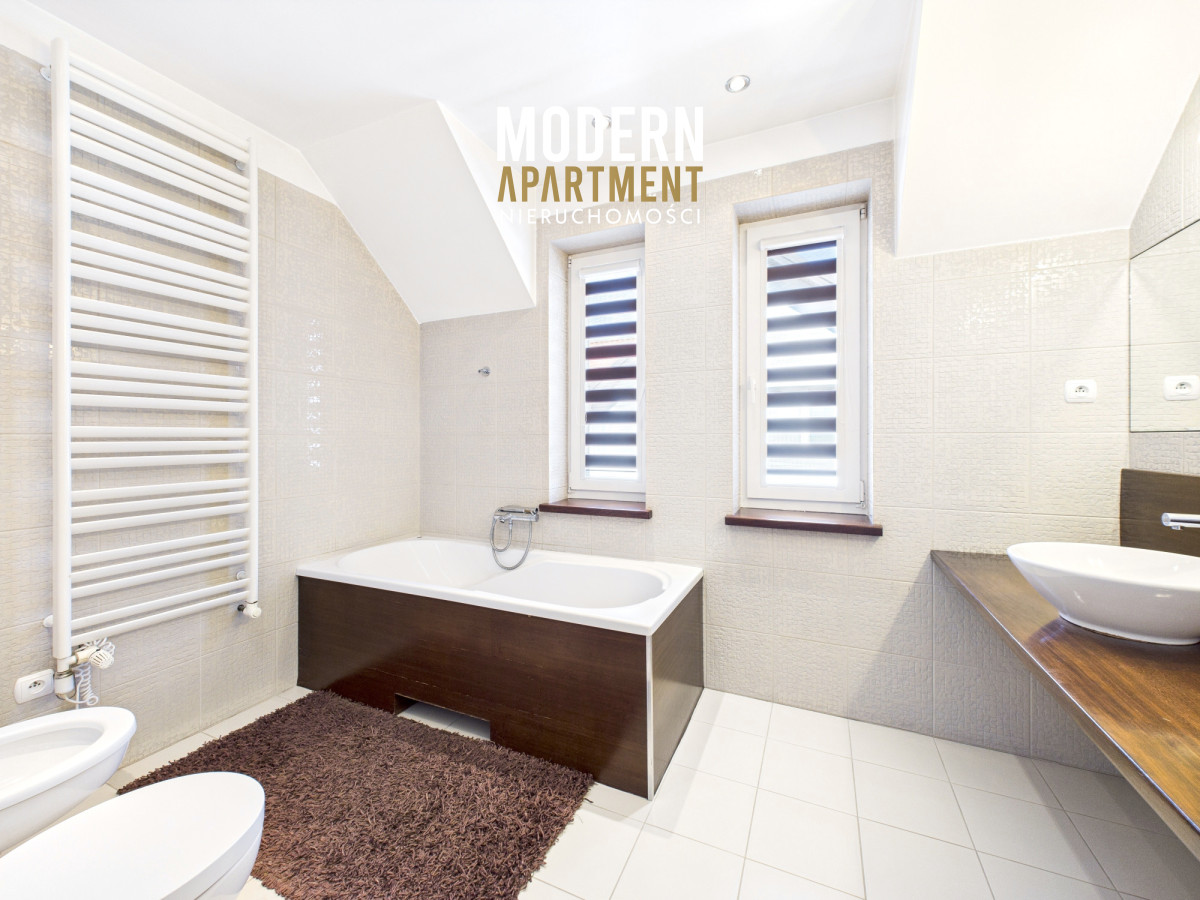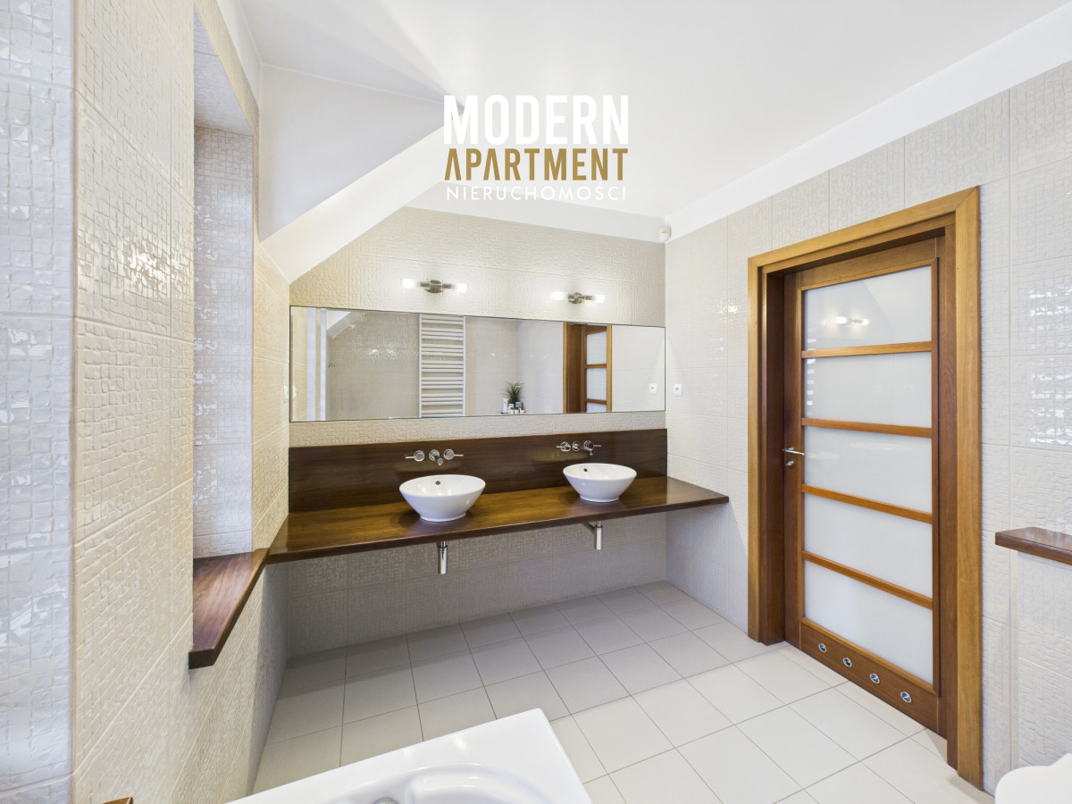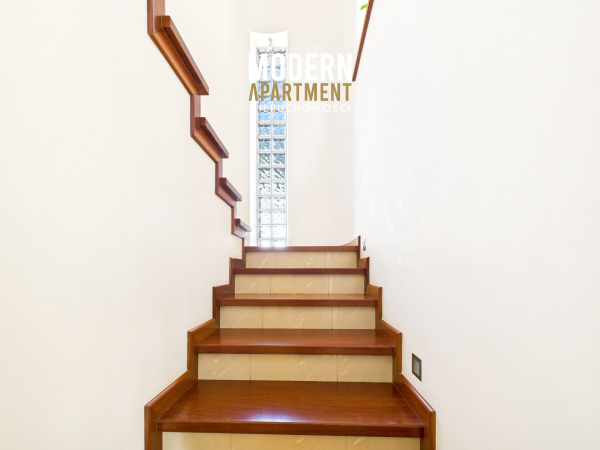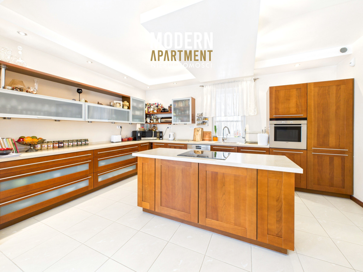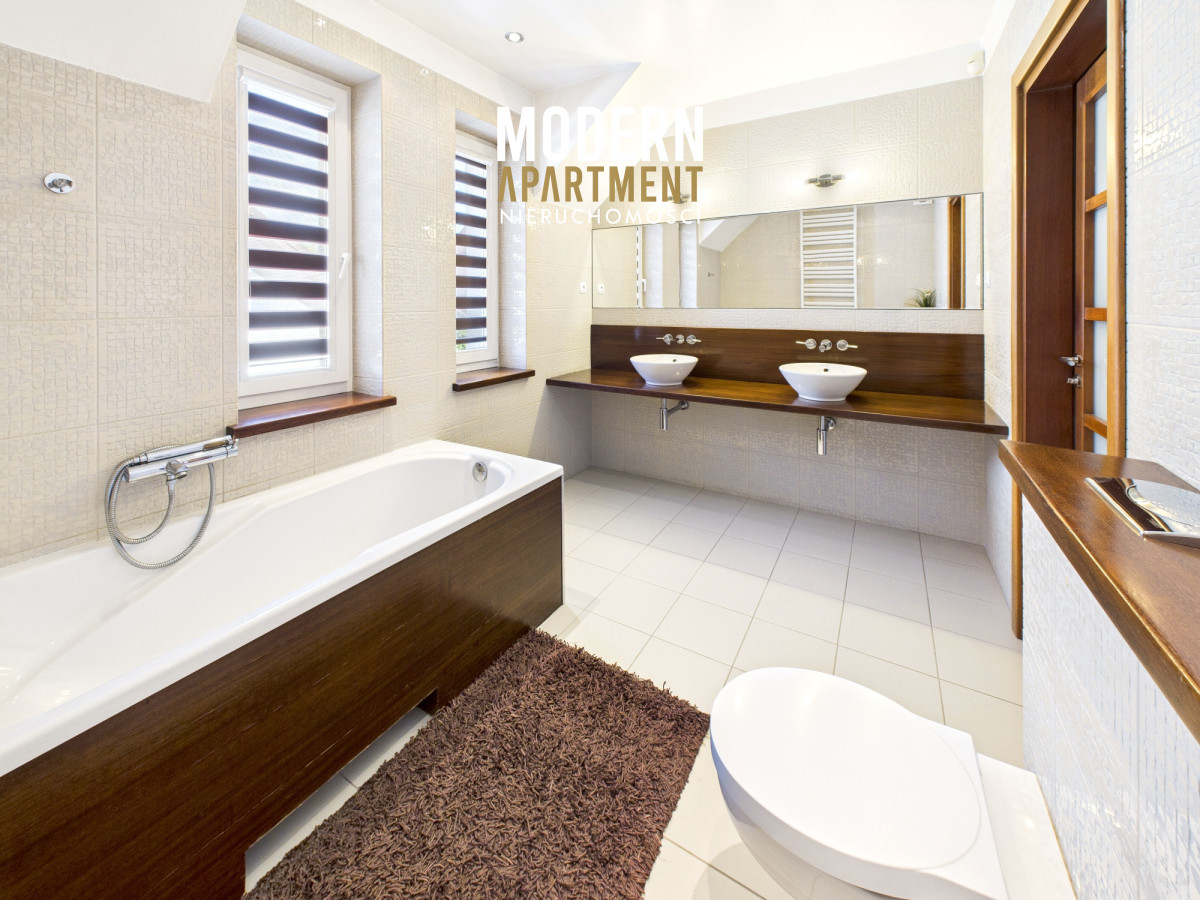 w dwufunkcyjny piec gazowy, kominek z rozprowadzeniem ciepła, centralny odkurzacz, system alarmowy oraz światłowód. Brama wjazdowa i garażowa sterowane są elektrycznie. Dach pokryty dachówką ceramiczną, okna, drzwi i parapety wykonane z drewna. Podłogi wykończone drewnem egzotycznym (czereśnia amerykańska) oraz gresem. Dojazd do posesji prowadzi utwardzoną i oświetloną drogą z kostki brukowej. Ogród wyposażony w system automatycznego podlewania. Zbiornik na deszczówkę zapewnia dostęp do wody nieograniczając dbania o ogród w okresach intensywnych upałów i suszy.
