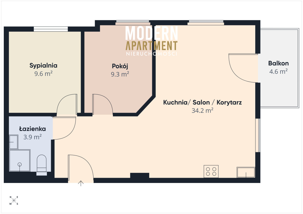 - Salon z aneksem kuchennym i korytarzem (ok. 34,2 m²): Otwarta, jasna przestrzeń dająca duże możliwości aranżacyjne. Z salonu wyjście na słoneczny balkon (4,6 m²). Kuchnia w zabudowie, wyposażona w niezbędny sprzęt AGD.