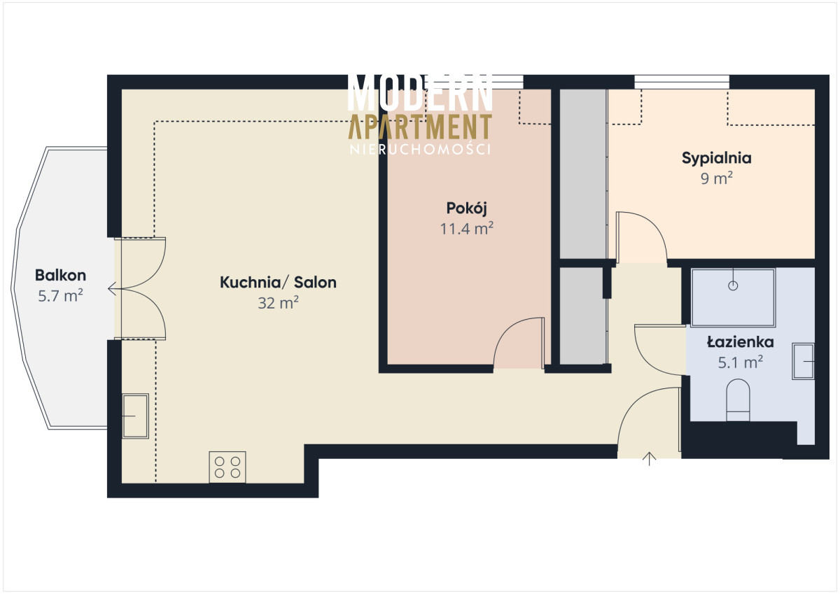 - przestronnego salonu z aneksem kuchennym oraz wyjściem na balkon,
